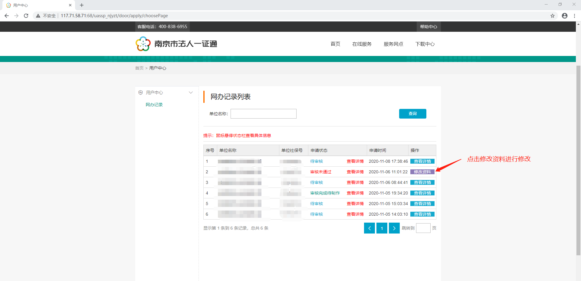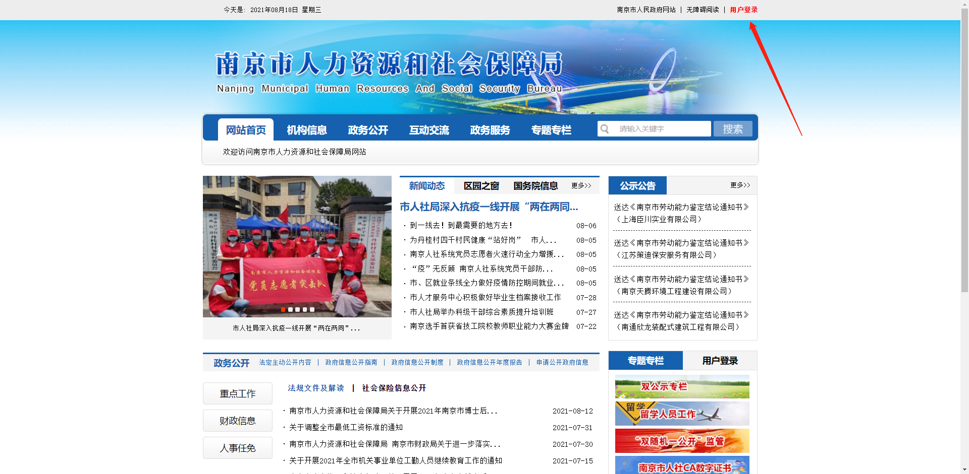 10、点击应用后,跳转至南京市人力资源和社会保障局界面,点击用户登录