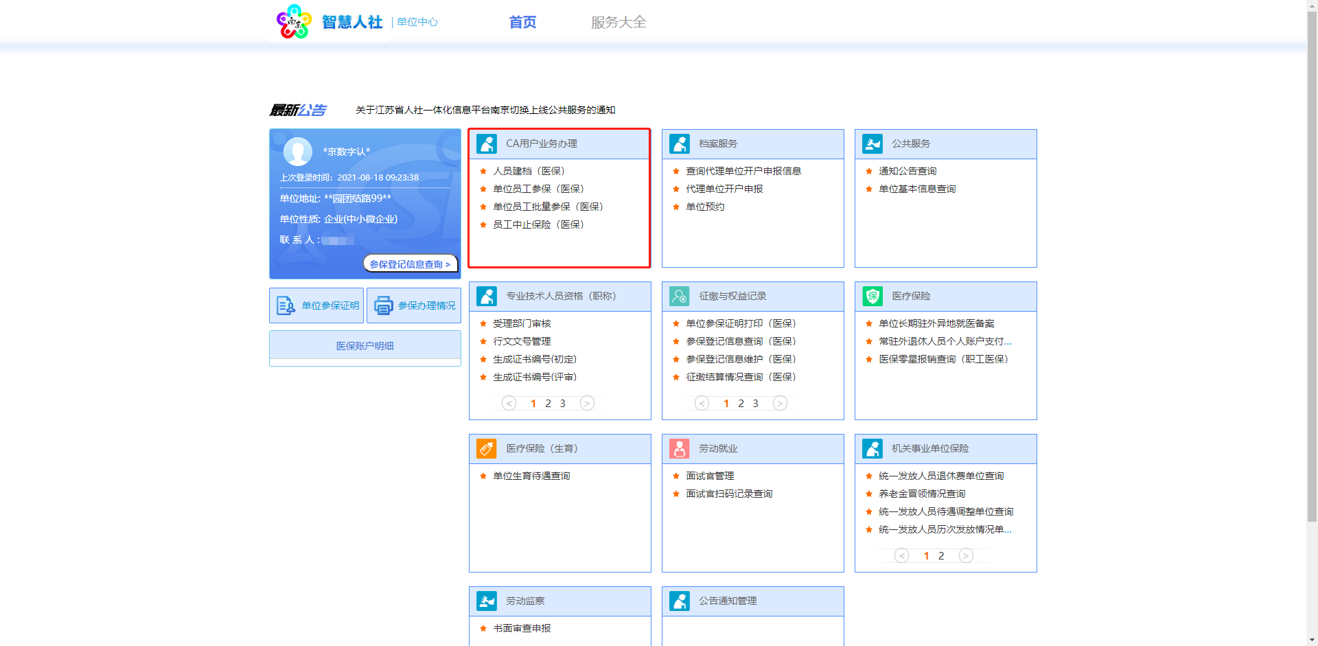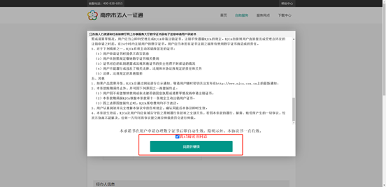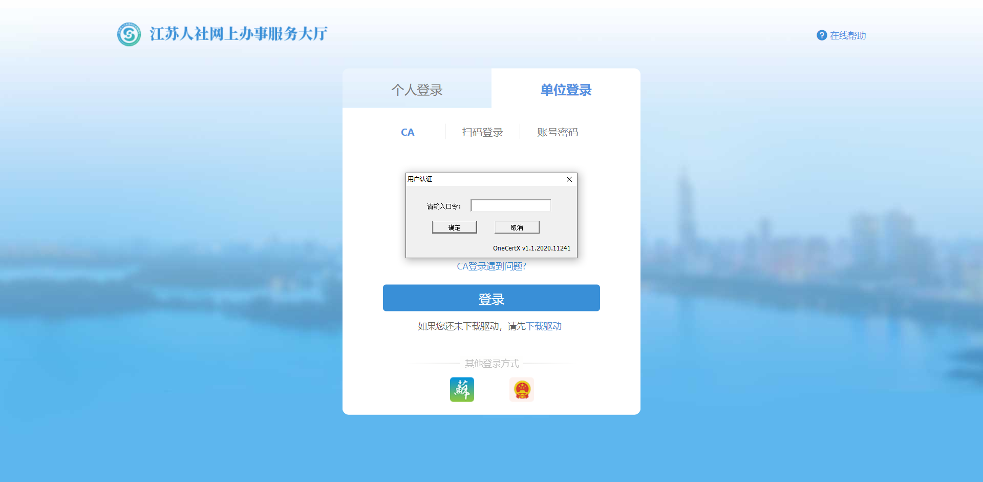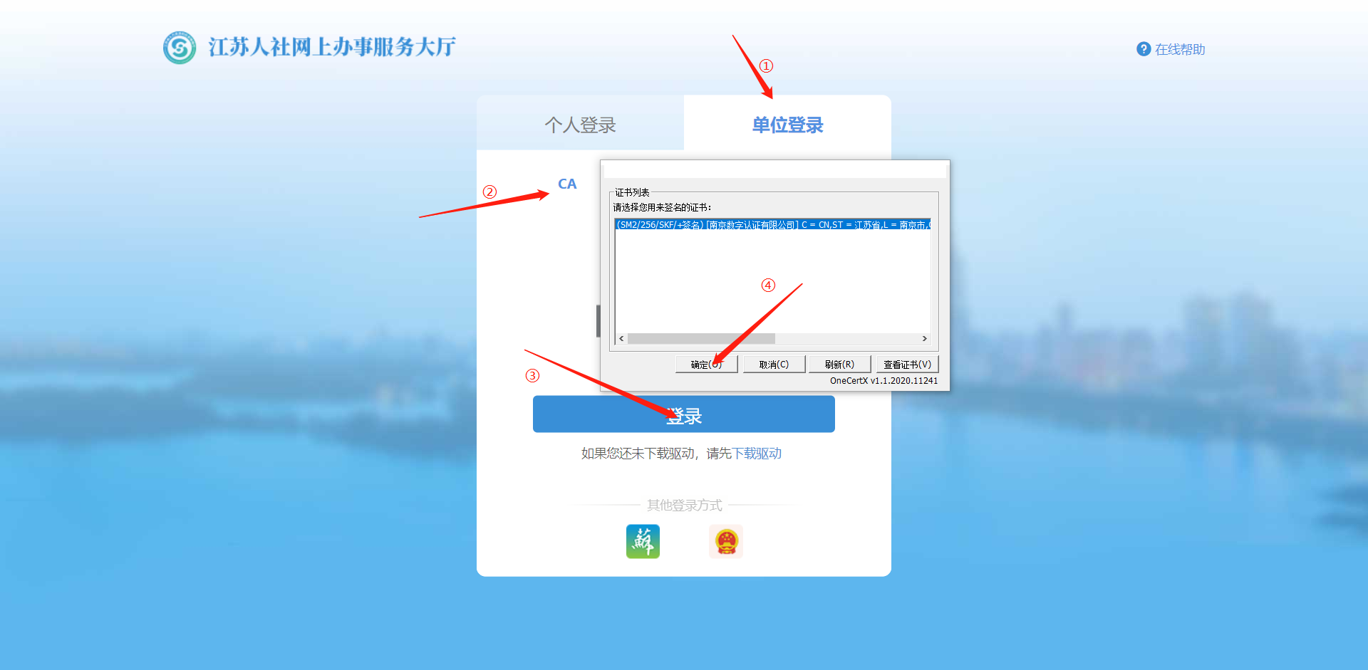 11、跳转至江苏人社网上办事服务大厅,选择单位登录用CA登录方式,点击登录页面弹出证书列表,选择CA证书,点击确定