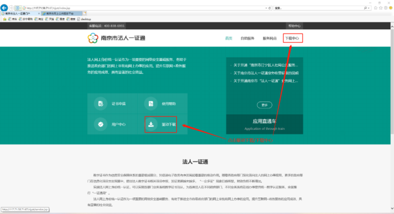 1、登录南京市法人一证通门户,进入首页,点击下载中心/驱动下载