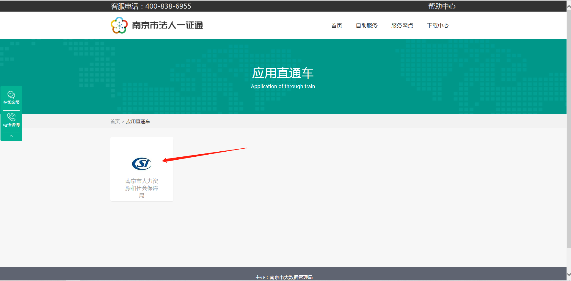 9、进入应用直通车界面,点击南京市人力资源和社会保障局