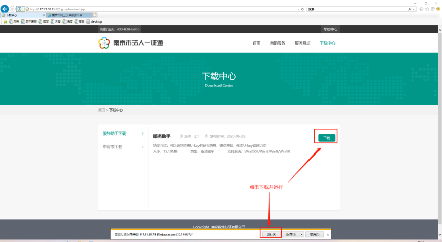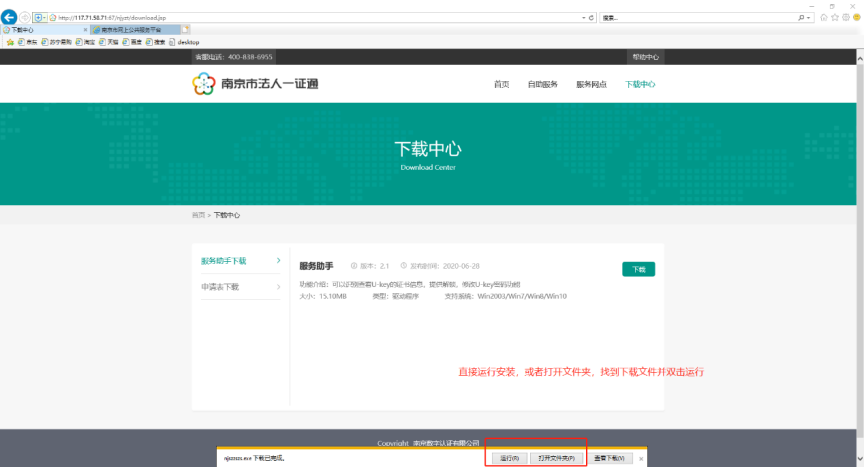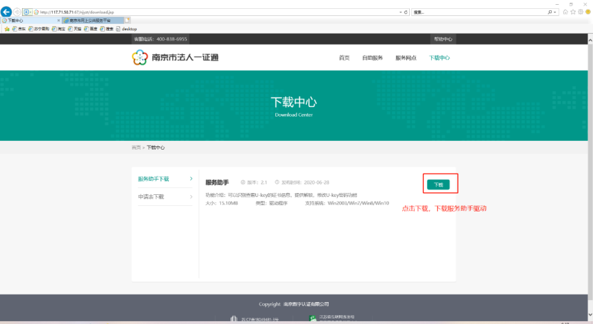 2、进入下载界面选择服务助手下载,点击下载,下载证书服务助手驱动