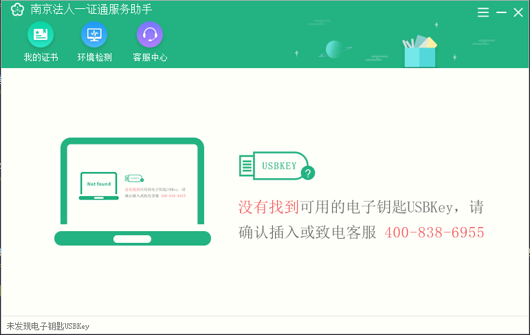 6、提示未插入U-key,请按照提示插入U-key,如已插入U-key,请重新插入稍等几秒,等待界面显示证书信息