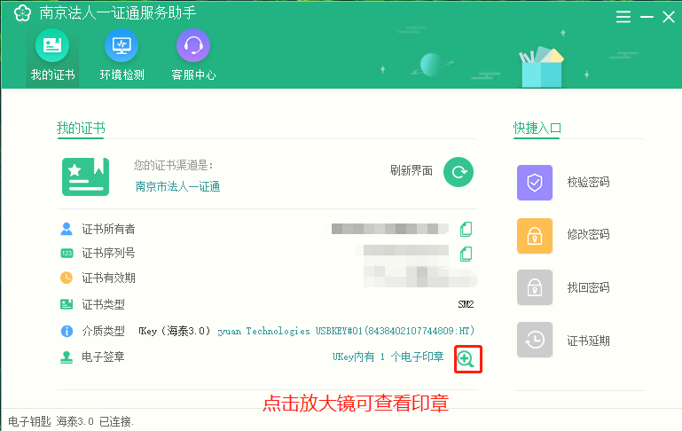7、插入U-key服务助手读取到证书信息后会在界面显示